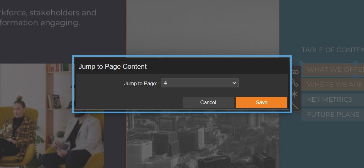 As your document gets longer, navigation matters more. Make it easy for your readers to find what they need with the ‘Jump to page’ module. It can be used to add links to specific pages in your document, making it perfect for a contents page or a quick 'Back to Home' button.