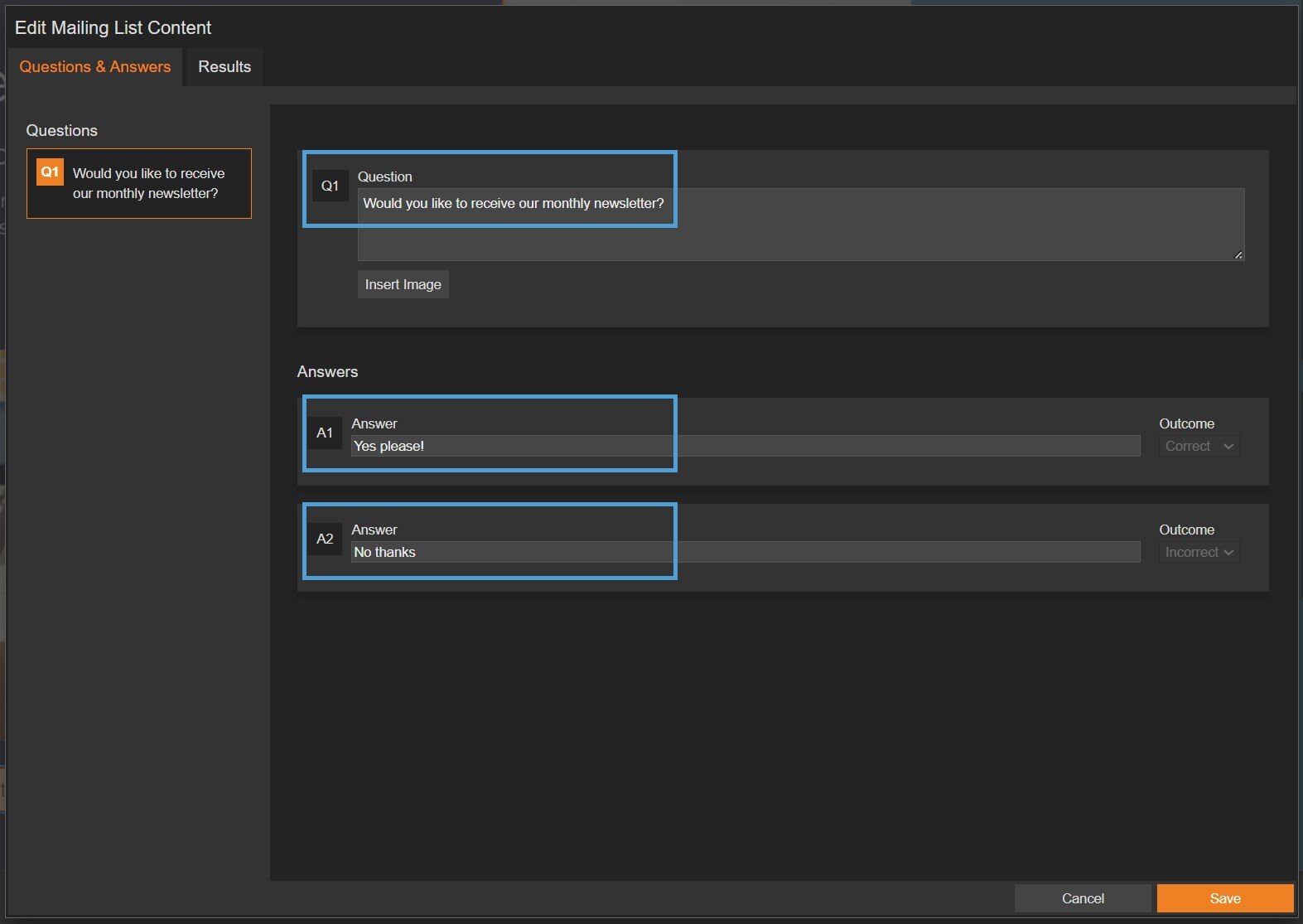 Two results are available, and will display depending on the answer that the visitor selected. For example, different wording will display if they chose 'No thanks' to 'Would you like to receive our monthly newsletter?'.