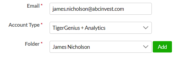 Enter the email address of the TigerGenius User and choose or add a Folder. It is recommended that you create a Folder for each TigerGenius User.