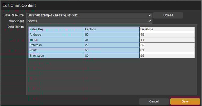 Select the chart data that you want to use from the 'Data Resource' drop-down list or upload a new one using the 'Upload' button.