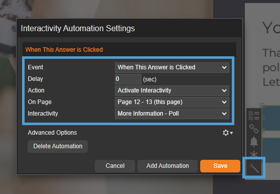 Automation is an exciting feature that makes it possible to trigger Interactivity without the visitor having to select a clickable area on the page. It can also be used to hide the results of a Poll module, which may be your preference instead of than showing the percentage of each Poll option.