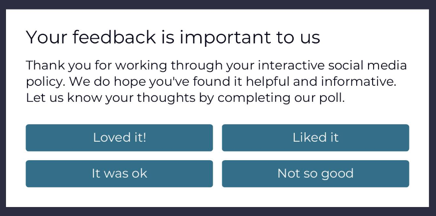 Ryan has created a Social Media Policy that includes a feedback poll on the final page. As the feedback is sensitive, he would like to keep the results confidential - to do this, he can use Automation to display a More Information pop-up box instead of the Poll results.