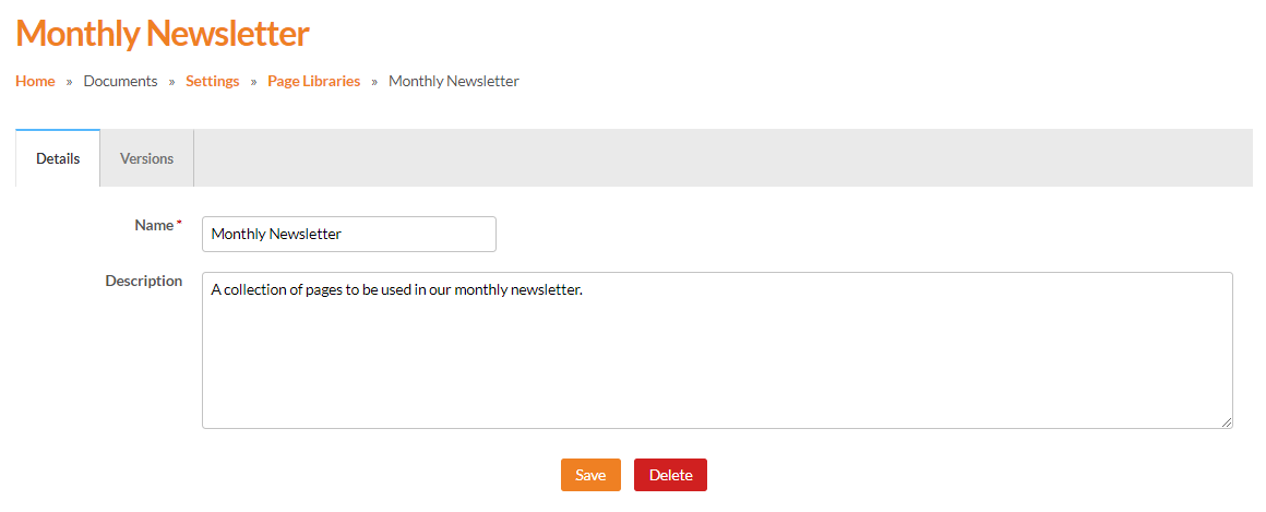 Use a descriptive name so it's clear what type of pages the Page Library will contain - for example, 'Monthly Newsletter'.