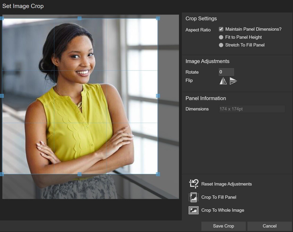 A pop-up box will display containing several crop options, as well as the option to rotate or flip the image.