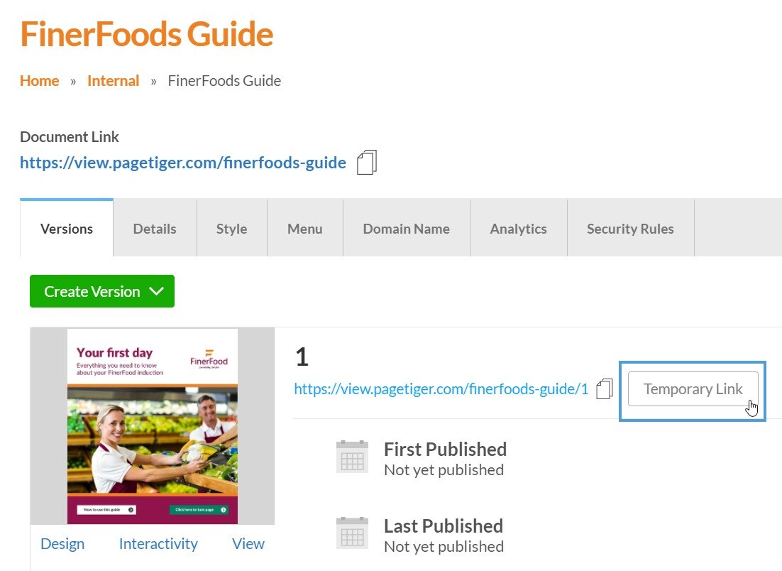 Select the 'Temporary Link' button for the Version.