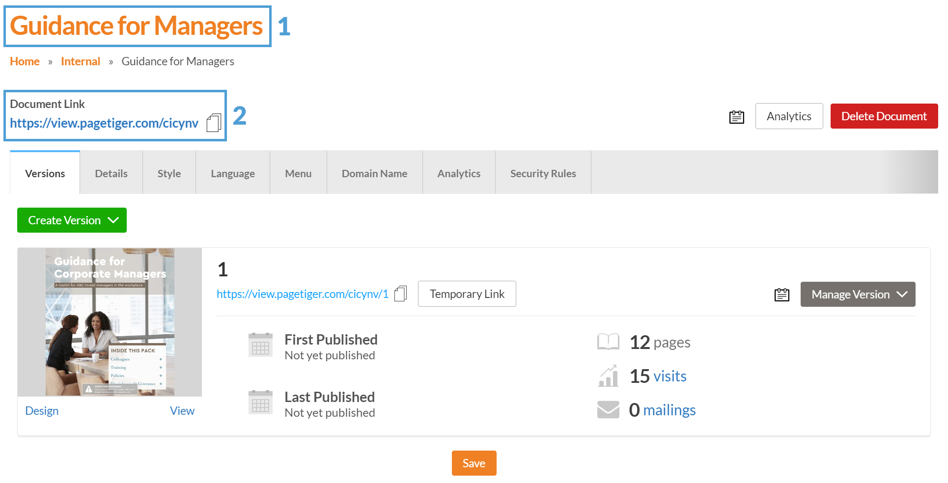 The Document Link is located at the top of the 'Manage Document' page, and opens the most recently created and published version in the document.