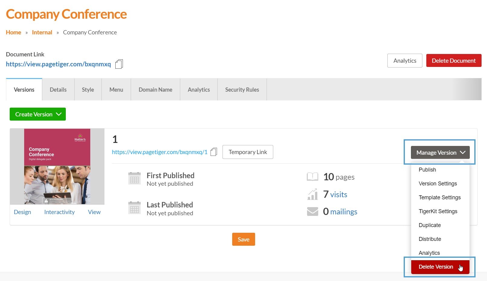 Select ‘Manage Version’ for the version you would like to delete.