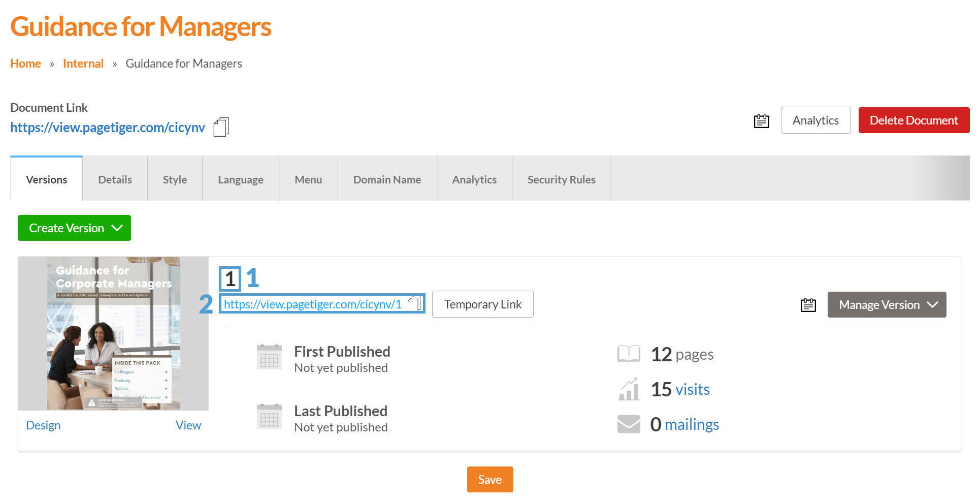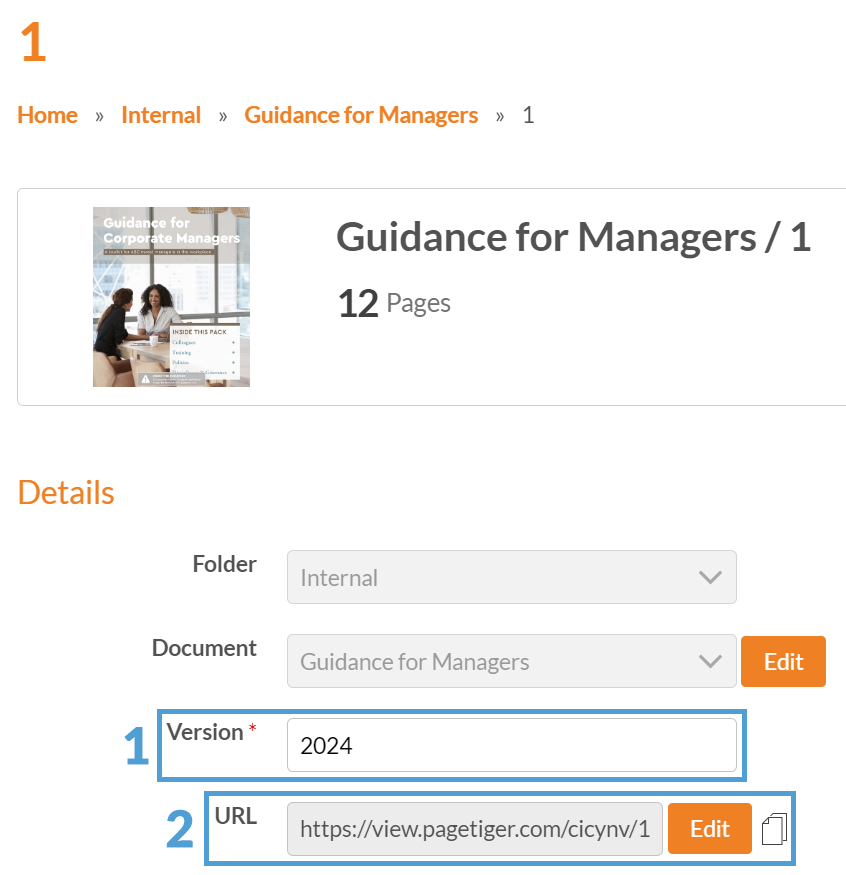 A version URL will always include the document URL - for example, 'cicynv' is the document URL for this version link > https://view.pagetiger.com/cicynv/1