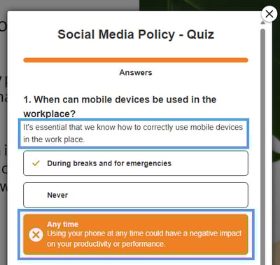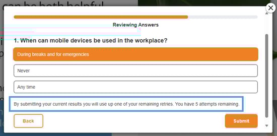 Checking this box will hide the 'Retry' button from appearing in the results pop-up, so visitors won’t be able to take the assessment again.