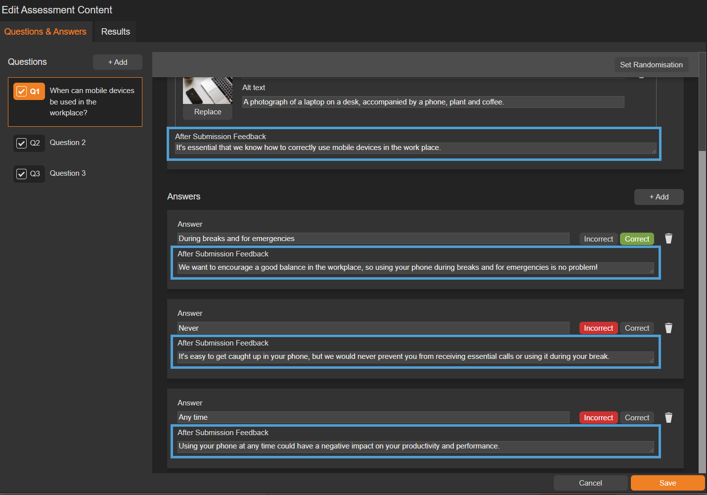 Feedback can be entered for questions and their corresponding answers - remember to keep it clear and concise!