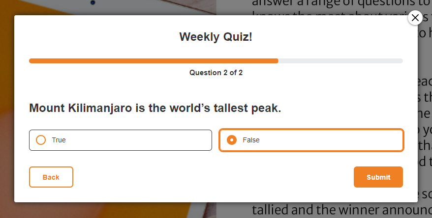 Two new question types have been added - 'Image Choice' and 'True or False'. 'Multiple Choice' questions are still available to use. Note: both Image Choice and Multiple Choice questions allow the user to select a single correct answer.