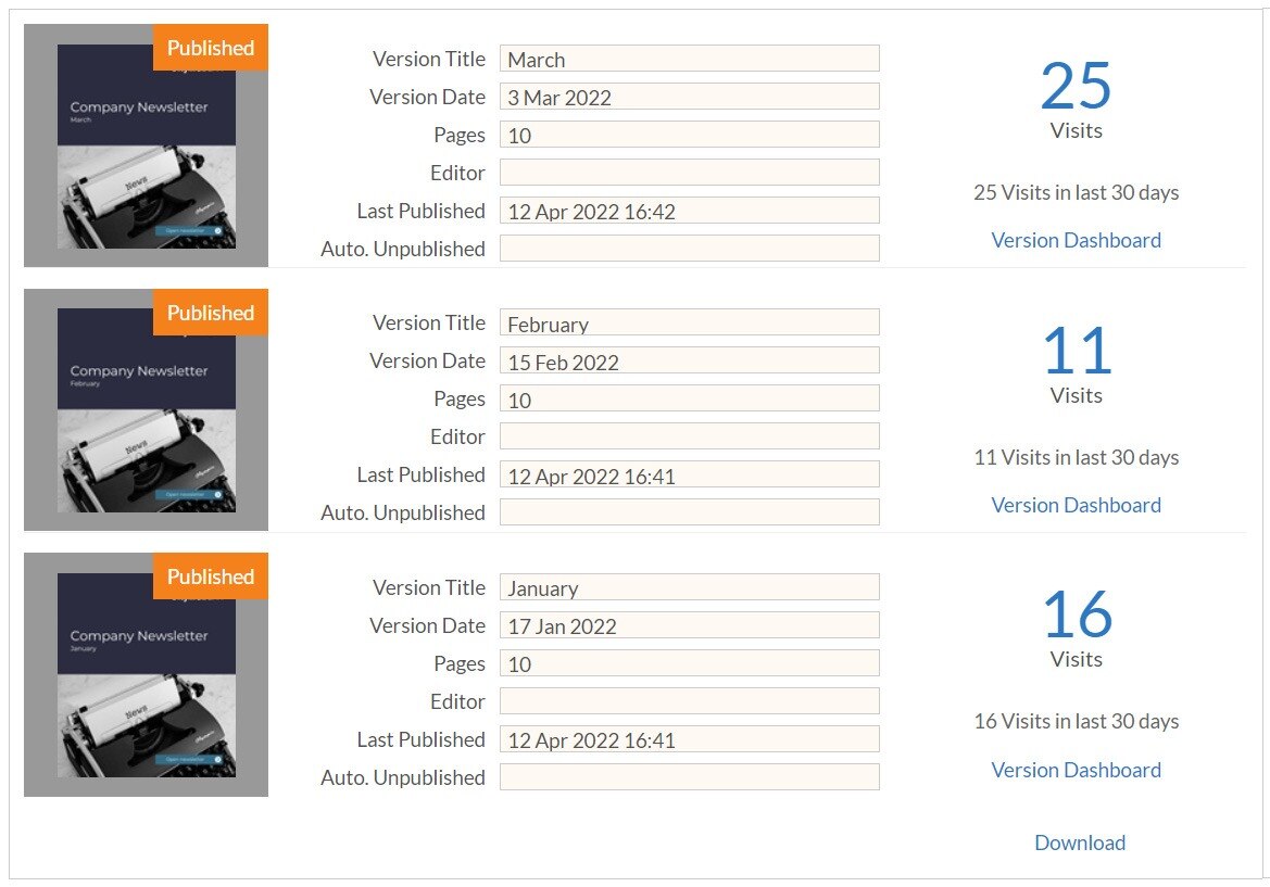 View and download the number of views that your document has had each month.