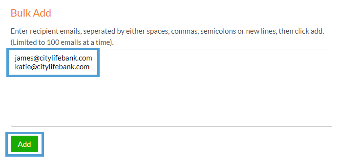 💡 Up to 100 email address can be added at a time, and must be separated by a space, comma, semicolon or new line.