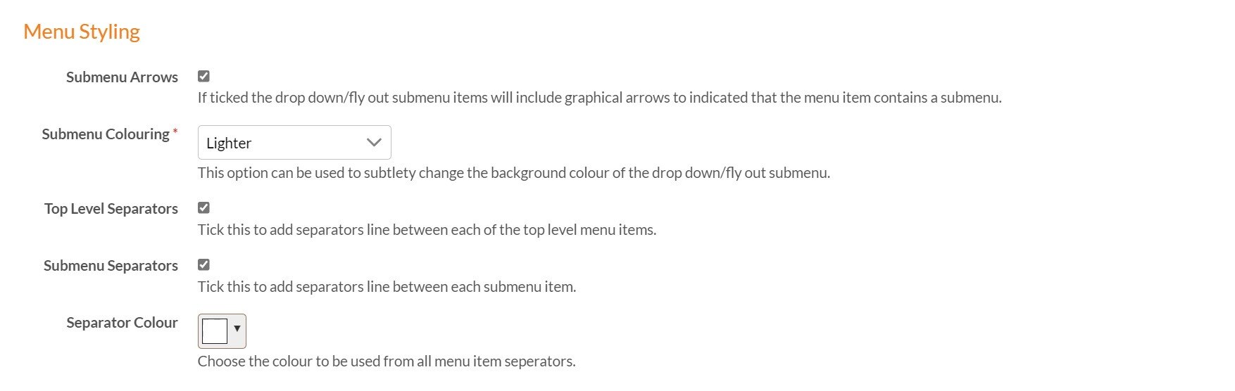 If this checkbox is select the drop-down submenu items will include graphical arrows to indicated that the menu item contains a submenu.