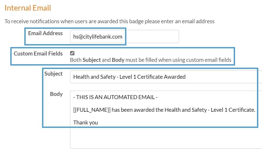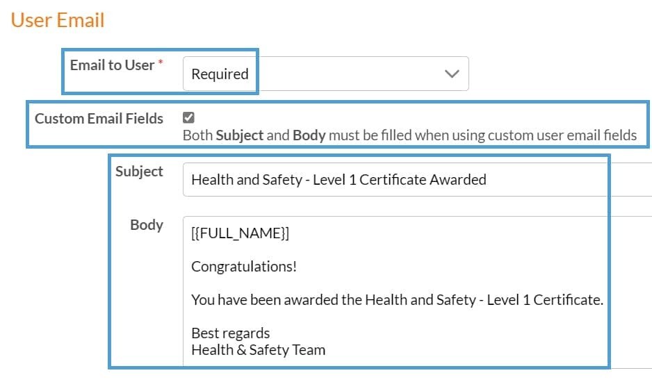 ​Tick this box if you would like to enter a custom message for the email that is sent to the internal user. Placeholders can be added to pull through information from the certificate that is generated, for example, Full Name or Team.