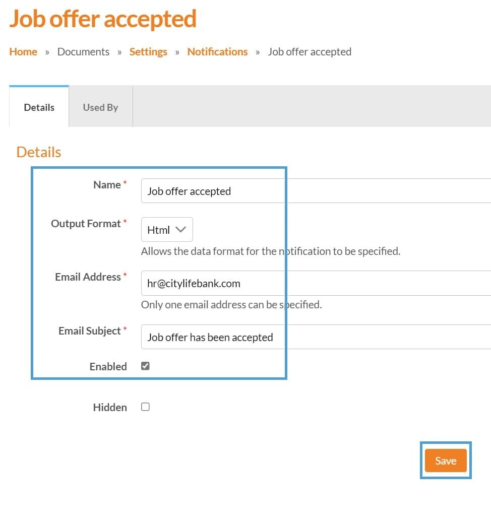 HR have sent out a job offer and would like to know when it has been accepted. The job offer pack contains an Assessment asking the visitor to tick to accept, so they have set up and added a Notification to it. Once accepted, an email will be sent to hr@citylifebank.com letting them know the good news. Simple!