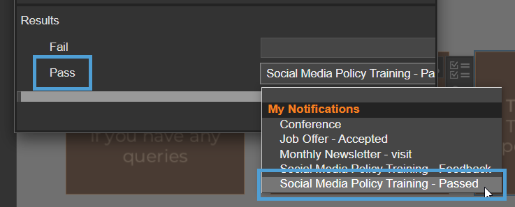 Select a Notification in the 'Results' section, in this example it will be sent when 'Pass' is achieved.