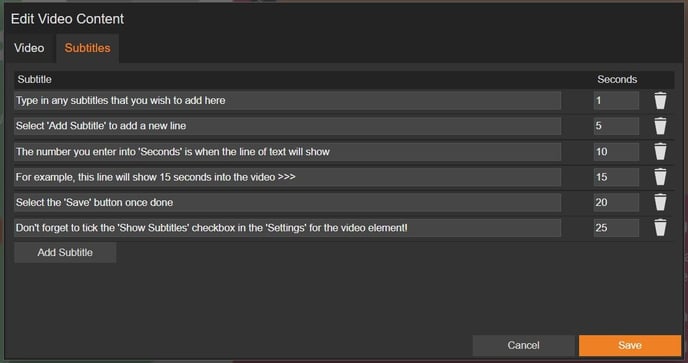 The 'Seconds' field is when the line of text will show on the video. For example, entering 5 will display the line of text 5 seconds into the video.