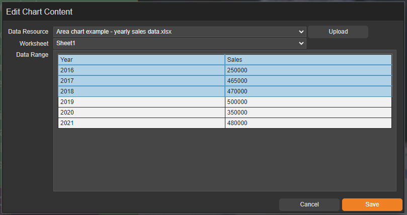 Select the chart data that you want to use from the 'Data Resource' drop-down list or upload a new one using the 'Upload' button.