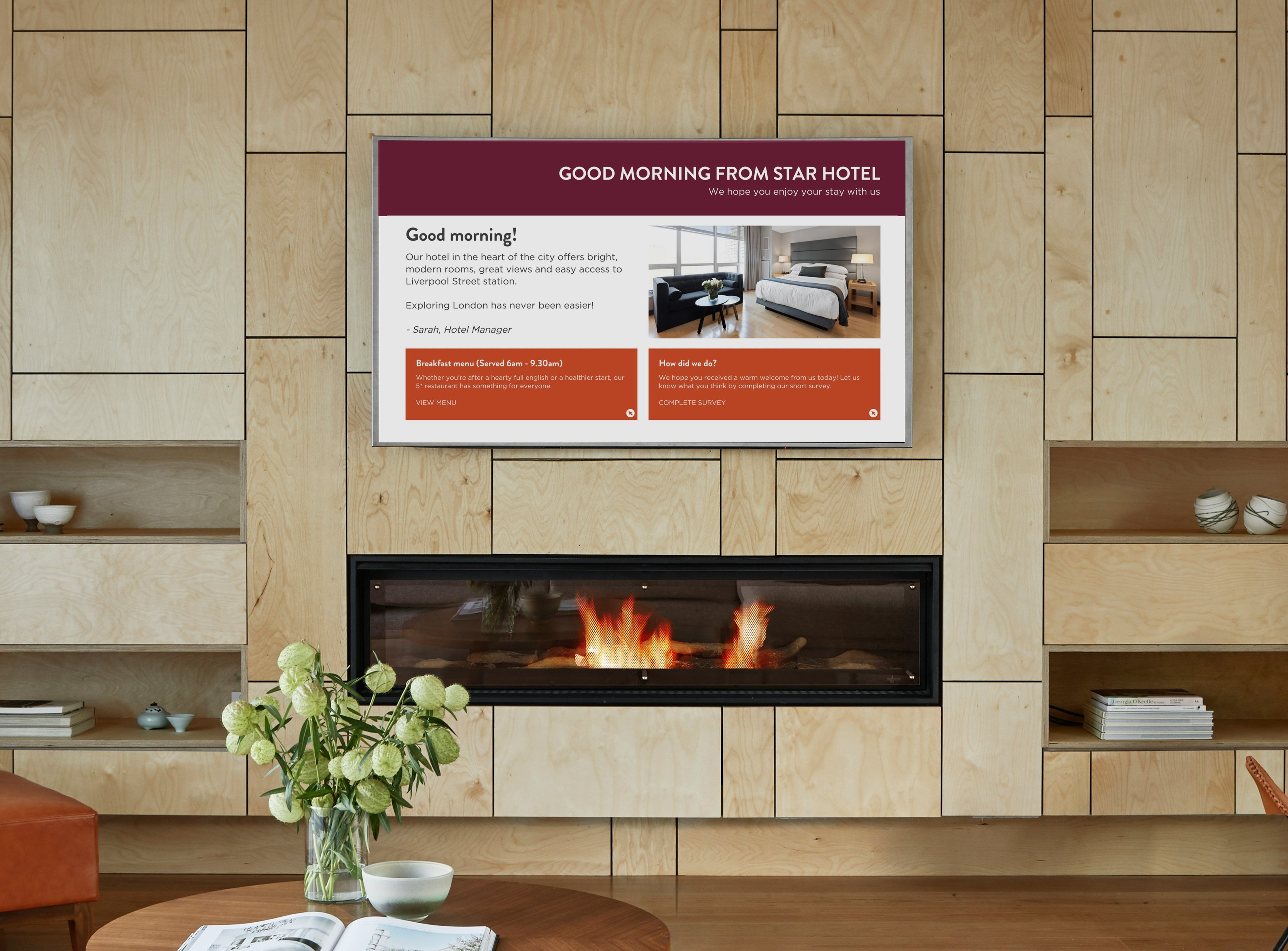 They download the TigerPlayer app to the digital screen in the hotel foyer and set the document called 'Star Hotel Welcome Message' to display.