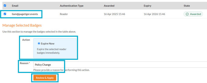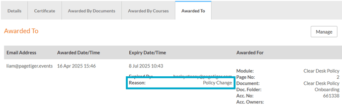 - The expiry reason will be recorded and displayed on the "Awarded to" tab for a Badge.
