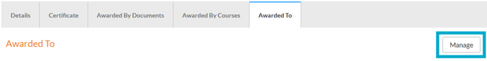 The 'Manage' option is also available on the 'Awarded To' tab for a badge.