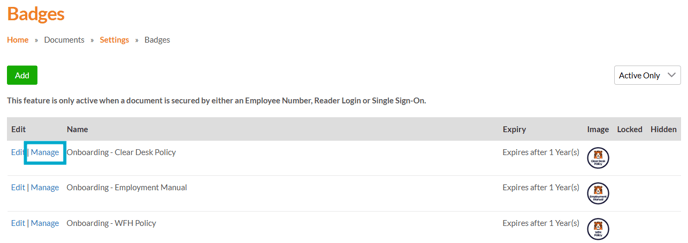 - Click 'Manage' next to the badge you want to update.