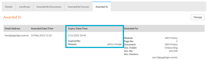 - The expiry date, reason, and email address of the person who expired the badge will be shown on the 'Awarded to' tab of the badge.