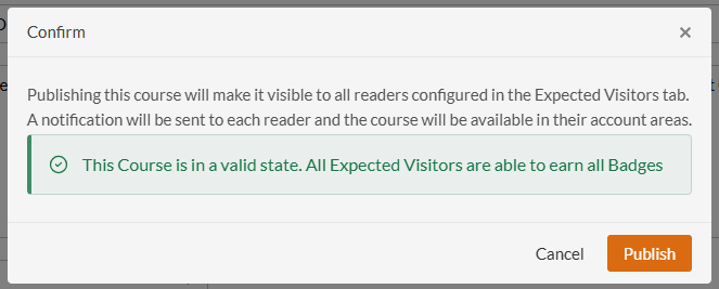 Before publishing a Course, make sure you have reviewed all aspects of the setup, including Course Details, Expected Visitor Lists, and Badges. If there are any flagged issues, you may wish to resolve them first as they can affect the user experience.