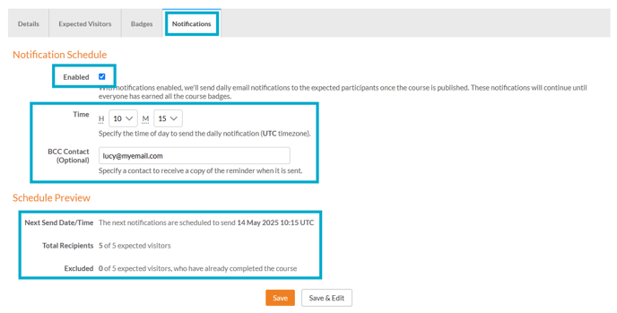 Turning notifications on will send daily emails to your participants to remind them that they have badges to earn in a course.