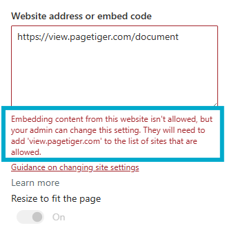 "Embedding content from this website isn't allowed, but your admin can change this setting. They will need to add "view,pagetiger.com" to the list of sites that are allowed."