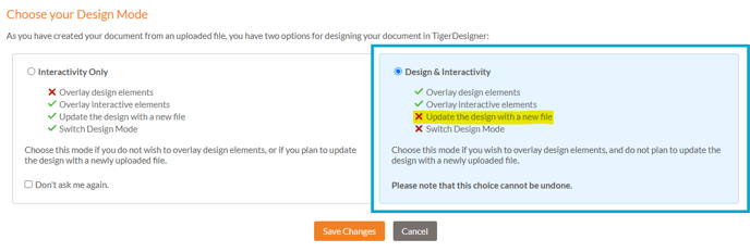 If you create a document by uploading a PDF file, any changes to the content will need to be made externally - for example, if you created the design in InDesign and save the file as a PDF, you will need to do this again for your updated version. This is because the design was not created within PageTiger Designer.