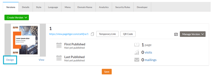 If you have an updated PDF file it can be replaced ('Manage Version' > 'Replace File'). Alternatively, you can import the PDF into Designer to add additional elements, such as Text or Image panels. This is done by selecting 'Design' (1) for your version followed by the 'Design & Interactivity' (2) option.