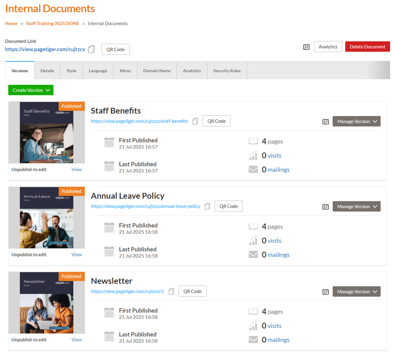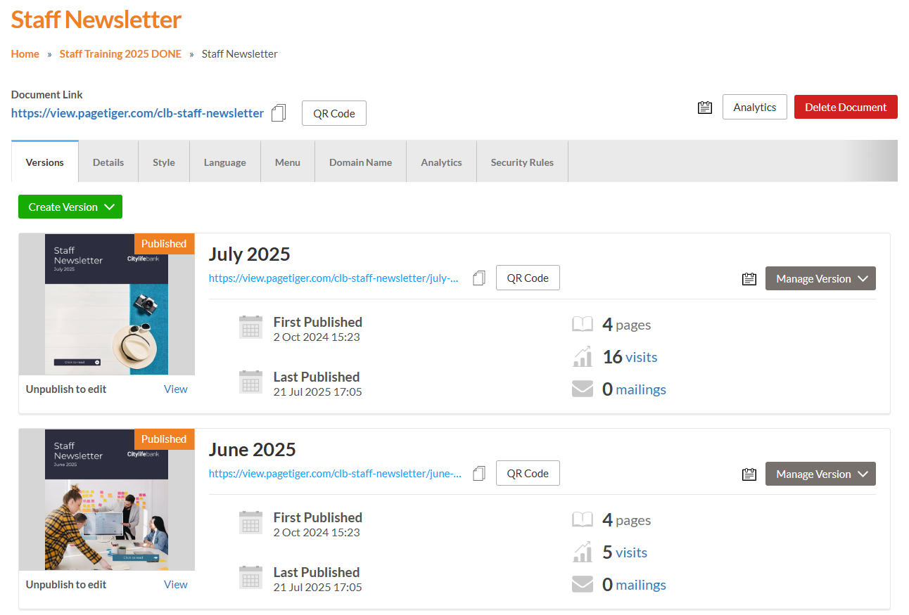 Since you have already printed many copies, we suggest creating a new document and moving all other versions (that you don’t want linked to the current QR code) into it. This ensures the QR code that you have distributed only points to the one version you intend to share.